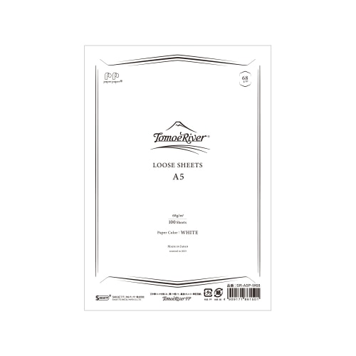 ●薄くて軽くて、裏抜けしにくい通常の52g/m2とは異なり、紙厚をもたせた三善製紙製トモエリバー68g/m2を使用しています。 ●52g/m2だと書き味は好きだが薄いと感じていた方へおすすめです。 ●紙色は万年筆インクの再現性に優れたホワイトです。 ●三善製紙製トモエリバーは繊維がより均一になり、平滑度とサイズ度(にじみにくさ)も向上。なめらかな書き心地で適度なコシもあります。 ●万年筆、ガラスペンはもちろん、ボールペンやインクペン、シャープペン、鉛筆などでもなめらかな書き心地が楽しめます。 ●カリグラフィーの練習の用紙にも最適です。 ●トモエリバー純正品の証であるロゴマークを表紙の中央付近に印刷しています。 ●用紙は1枚ずつバラになっているので、使い切りや簡易的な筆記はもちろん、メモ帳やノートなどセルフで加工ができる素材用のアイテムとしても最適です。 ●何度も口を開けたり閉じたり出来るパック入りです。後ろに片面白の板紙が1枚入っています。