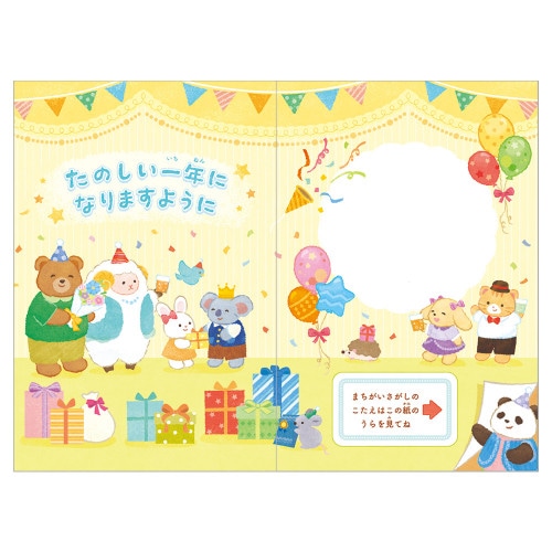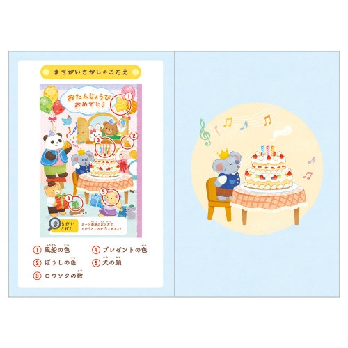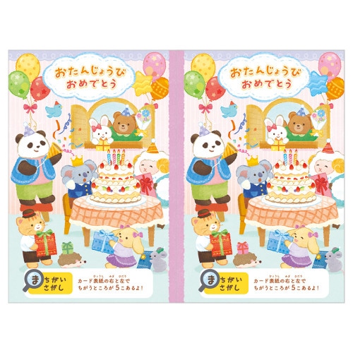 動物たちの楽しい誕生日パーティー!左右のイラストを見比べて「まちがいさがし」をしてみよう お祝いの気持ちと一緒に、間違い探しで遊ぶ楽しみも贈れるバースデーカードです 中紙の裏面に答えが掲載されています (洋形1号封筒) 絵柄付中紙入:両面印刷