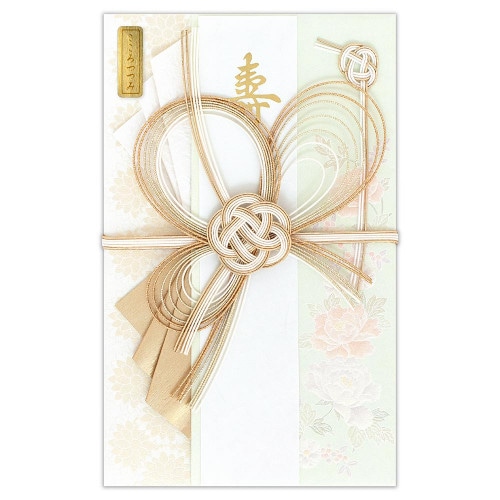 牡丹の花をパールシルク印刷とエンボス加工で上品に表現した寿金封です 淡い緑の絵柄が花嫁衣装の色打掛を思わせる華やかなデザインです 贈る金額の目安は、5万円?です 70万円まで入ります パールシルク印刷、エンボス加工 多当型中袋入 短冊2種類入(寿2枚・ご結婚御祝) 説明書入