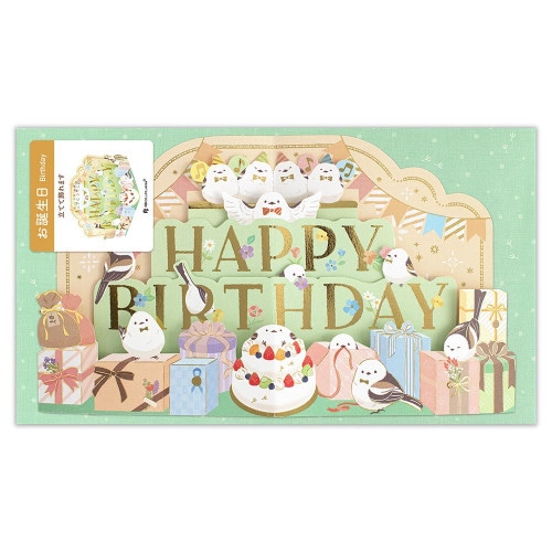 もらって嬉しい、飾って華やかなバースデーカード 下部を左右から押すと簡単に立てて飾れます コーラスや飾り付け、プレゼントの準備を頑張るシマエナガたちが笑顔を届けます カード:金箔押し加工 封筒:印刷入 飾り方の説明書・折れ防止用厚紙入 定形内料金で郵送できます