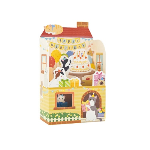 ミニチュア風のおうち型のバースデーカード。 デスクや棚に立てて飾れます。 猫たちがホームパーティーを開いて誕生日をお祝いしてくれるデザインです。