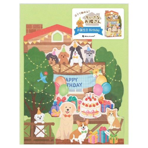 ミニチュア風のおうち型のバースデーカード。 デスクや棚に立てて飾れます。 犬たちがガーデンパーティーを開いて誕生日をお祝いしてくれるデザインです。