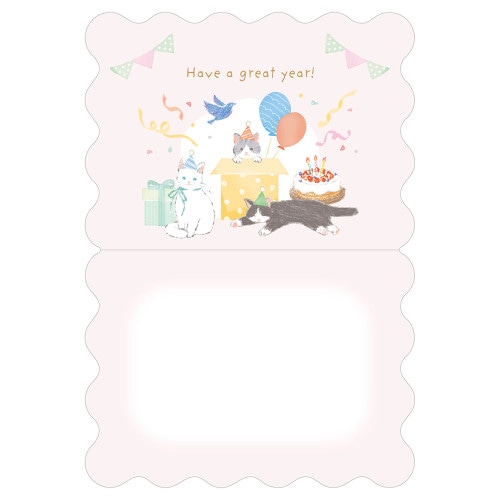 My mood -マイムード- 明るく楽しい気分を引き出す、軽やかなカラーのシリーズ。 プレゼントに添えるのにぴったりな、ミニサイズのバースデーカードです。 猫やケーキ、風船、プレゼントを優しく描きました。※郵送できません