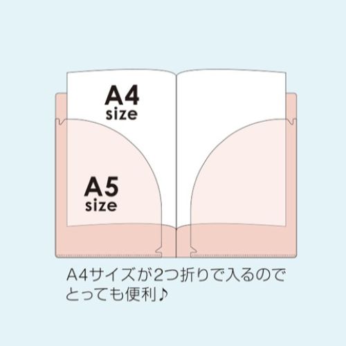 見開きタイプのクリアファイル。A4サイズが2つ折りで入ります。表紙に入っている星型のスパンコールは、シャカシャカ動きます。