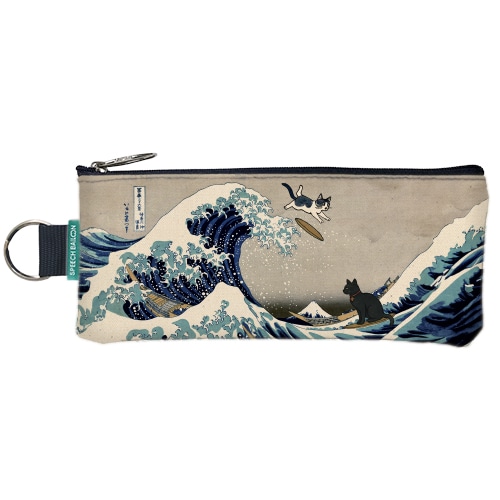 神奈川沖浪裏の世界を旅する猫たちを描いたペンケース。ダイナミックな波と猫たちの表情が、日常に遊び心を添えます。文具や小物をまとめながら、アートを気軽に楽しめます。
