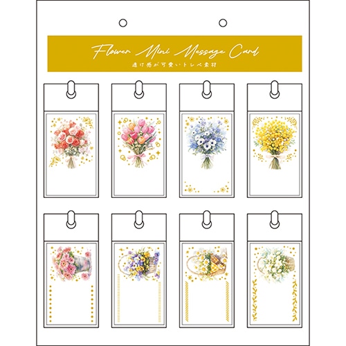 透け感のあるトレーシングペーパー素材のミニカードです。フラワーのイラストと金の印刷で高級感のあるデザインになっています。2種の絵柄が5枚ずつ入っています。