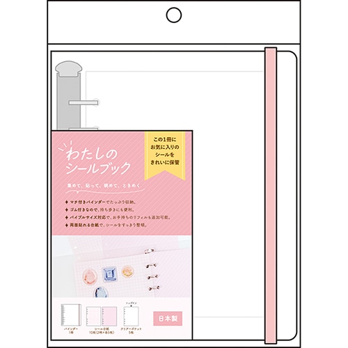 リフィルを追加して使える、バインダータイプのシール帳です。ゴムバンド付きで持ち運びもしやすい仕様です。バイブルサイズ対応なので、同サイズのリフィルも綴じて使えます。