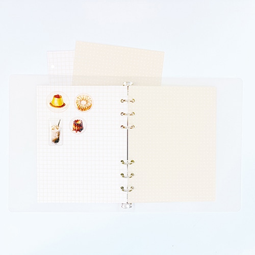 リフィルを追加して使える、バインダータイプのシール帳です。ゴムバンド付きで持ち運びもしやすい仕様です。バイブルサイズ対応なので、同サイズのリフィルも綴じて使えます。
