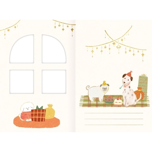 カードを開くと景色も広がる、新商品の窓あきメッセージカードが登場!窓からのぞくやさしい世界に心ときめくメッセージカードです。箔押し印刷がキラッと光って、冬のどんな場面にもぴったりで、想いを添えられます。【検索ハッシュタグ】#古川紙工#冬#メッセージカード#カード#ワンワンパーティー