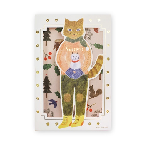 金箔が施されたはなやかな表紙と、中紙に描かれた絵が重なって2枚の絵になる、かわいくて楽しいカードです。