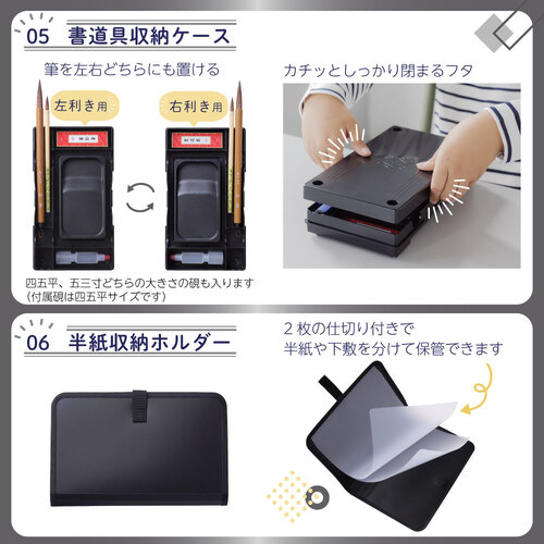 【内容品】 太筆、細筆、固形墨、墨液(180mL)、軽量両面硯(表面:硯、裏面:墨池)、ラバーツイン文鎮(185g)、下敷(4マス・6マス両面罫線入り)、半紙収納ホルダー、筆巻(マジックバンドタイプ)、スポイト式水差し、書道具収納ケース(左右両用・筆置き兼用)、筆の説明書、なまえシール、ショルダーベルト ※「マジックバンド」は株式会社クラレの登録商標です。 ★高品質・高機能なバッグ! ・飽きのこないスタイリッシュデザイン。 ・バッグ背面に便利なファスナーポケット付き。 ・フルオープンで出し入れ簡単。内側ポケットとゴムバンドで固定してすっきり収納できる。 ・背面上部がメッシュ生地で通気性抜群。 ・ショルダーベルト付きで2WAY仕様。 ・ネームラベル付き(個人情報に配慮してバッグの内側に縫い付け)。
