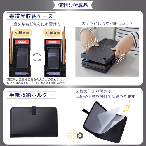 ・飽きのこないスタイリッシュデザイン。 ・バッグ背面に便利なファスナーポケット付き。 ・フルオープンで出し入れ簡単。内側ポケットとゴムバンドで固定してすっきり収納できる。 ・背面上部がメッシュ生地で通気性抜群。 ・ショルダーベルト付きで2WAY仕様。 ・ネームラベル付き(個人情報に配慮してバッグの内側に縫い付け)。 【付属品】半紙収納ホルダー、書道具収納ケース(左右両用・筆置き兼用)、ショルダーベルト