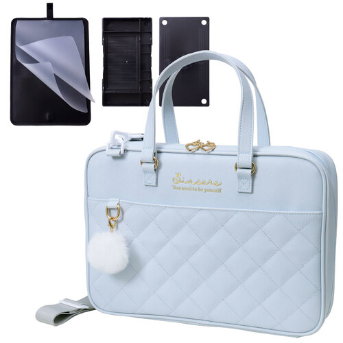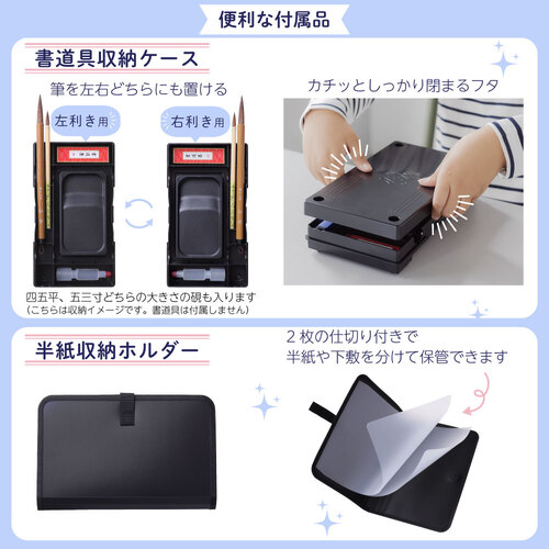 ・高級感のあるレザー調生地。 ・バッグ前面に便利なポケット付き。 ・細部までかわいいメタルパーツやポンポンチャーム。 ・フルオープンで出し入れ簡単。内側ポケットとゴムバンドで固定してすっきり収納できる。 ・背面上部がメッシュ生地で通気性抜群。 ・ショルダーベルト付きで2WAY仕様。 ・ネームラベル付き(個人情報に配慮してバッグの内側に縫い付け)。 【付属品】半紙収納ホルダー、書道具収納ケース(左右両用・筆置き兼用)、ショルダーベルト