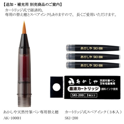 一本一本、紋様も太さも手触りも微妙に異なる天然竹。その二つとない素材を用いた所有する喜びを満たしてくれる筆ペンです。桐箱入りでご贈答にもおすすめです。 ・奈良筆と同じ製筆技術で手づくりした穂先。コシの強い人造毛を使い、一本ずつ丹念に造筆しております。 ・水性顔料インクを使用しており、筆跡は乾くと水に流れず色褪せしにくいため、長期保存にも適します。 ・専用のスペアインク(SKI-200)や替え穂(AK-1000H)があり、長くご使用いただけます。
