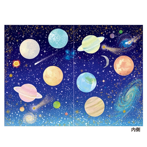 未来への無限の広がりと煌めく星々を描いた宇宙柄のカードは、退職や卒業など人生の新たなステージへ旅立つ方へ「成功を祈る」応援の気持ちを込めて贈るのに ぴったりな1枚です。宇宙柄は新しい始まりと成長を意味するので、もちろん誕生日祝いにもお使いいただけます。シール8片付き【検索ハッシュタグ】#チキュウ#寄せ書き#色紙#少人数#宇宙
