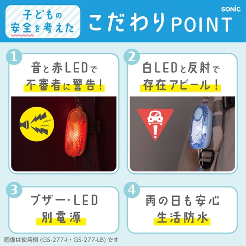 不審者・車から子どもを守る!防犯&交通安全対策 【防犯】大音量ブザーと赤LEDで不審者に警告 【交通安全】白LEDと反射でドライバーに存在アピール