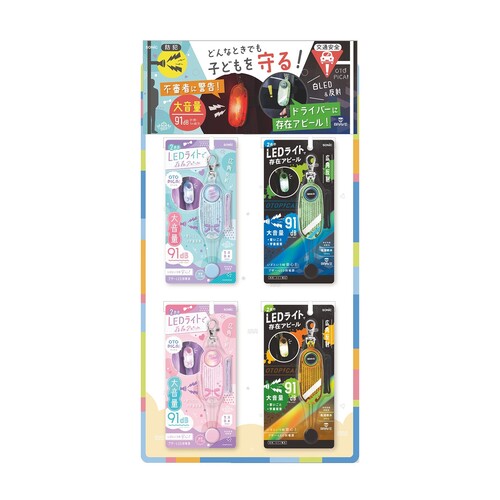 店頭販促にオススメな吊り下げ什器!不審者・車から子どもを守る!防犯&交通安全対策 【防犯】大音量ブザーと赤LEDで不審者に警告 【交通安全】白LEDと反射でドライバーに存在アピール