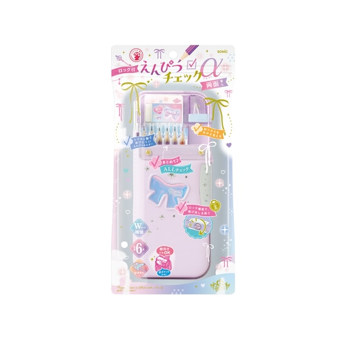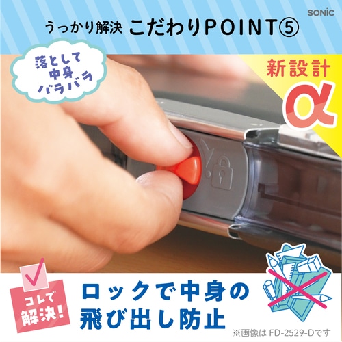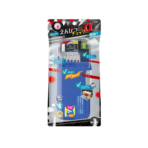 鉛筆の削り忘れや入れ忘れ、消しゴムが無い!…そんなうっかりを1か所チェックで解決!えんぴつチェックα両面筆入 フタを開けずに、外側から鉛筆の芯先が見える設計で、フタを閉じたままでも鉛筆の削り忘れや入れ忘れのチェックができる 筆入の蓋が開いて中身が飛び出しちゃう。を解決する、両面ロック機能付き。簡単操作で開閉をロック!シリコン製の鉛筆ホルダーで、軽く差し込むだけで、走って揺れてもしっかり鉛筆をホールド!最薄クラスのスリムボディーでランドセルへは横向きにも、前ポケットにも、スキ間へスッキリ収納!しかも頑丈!裂けに強いメッシュ+PVCの2層構造「Wシート補強」で開閉耐久UP!授業のことを考えて、鉛筆は5教科分+赤鉛筆の合計6本収納できるペンホルダー 大容量、小学校の標準的な筆入の中身の持ち物リストに対応 付属の鉛筆削りは外から削りカスが見えるので「うっかり捨て忘れ」も防ぎ、鉛筆削りが不要の場合は取り外しができる カーボン調の生地とドットタグがおしゃれなブレイブシリーズとオーロラ加工のアップリケがキュートなリアナティアラシリーズ♪