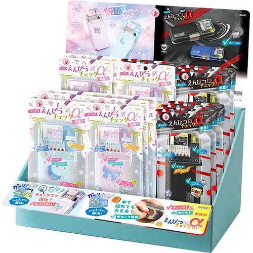 店頭販促にオススメな置き型什器! 鉛筆、消しゴム、削り器、名前ペンもまとめてチェック!えんぴつチェックα両面筆入 フタを開けずに鉛筆の先端が見えるチェック窓がパワーアップ!