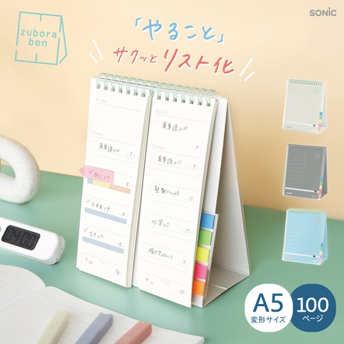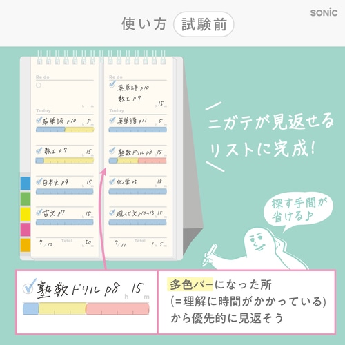 1日たった2分で「やること」「ニガテ」を一目瞭然に!100日分の勉強リスト 勉強机の上など目のつくところにスタンドさせておけば、「やること」常に確認しながら勉強できる 表紙が留められるバンド付で、持ち運びにも◎ 内側のバンドにページを挟んでおけば、しおり代わりにも 「やること・時間」書くだけ!サクッとリスト化で勉強をスムーズに始められる 「昨日」と「今日」のページが見れる2連のメモ 前日の振り返りをしながら、学習計画を立てよう 「やること」の下にある「理解度バー」は、マーカーでバーをひいてニガテを見える化!伸びしろが大きい所から効率的にやり直せる ふせん付き(約100枚入) 分からない問題はとりあえずふせんを貼って飛ばす→後日、先生に確認で脱ダラダラ勉 【サイズ】A5変形(約 H190×W148mm)【ページ数】100ページ