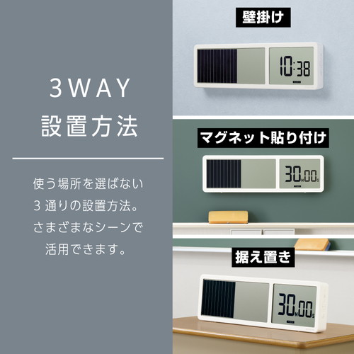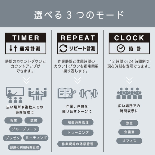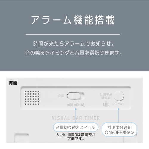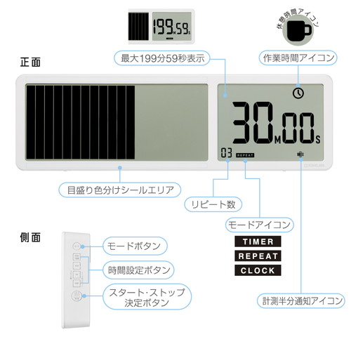 バーの目盛りで残り時間が一目で分かる大型タイマーです。通常計測モードとリピート計測モード、時計モードの選べる3つのモードを搭載。
