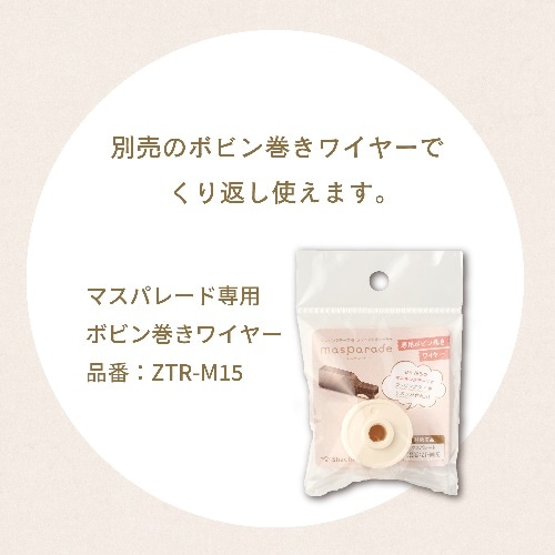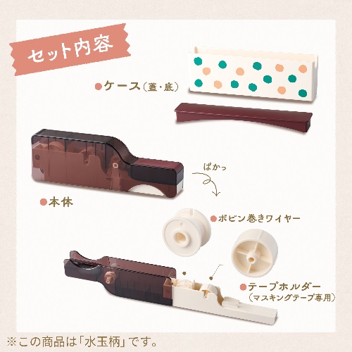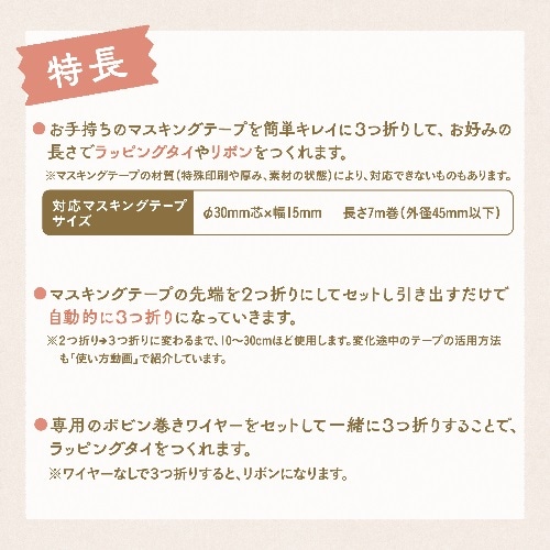お手持ちのマスキングテープを簡単キレイに3つ折りして、お好みの長さでラッピングタイやリボンをつくれます。マスキングテープの先端を2つ折りにしてセットし引き出すだけで自動的に3つ折りになっていきます。専用のボビン巻きワイヤーをセットして一緒に3つ折りすることで、ラッピングタイをつくれます。ワイヤーなしで3つ折りすると、リボンになります。専用のボビン巻きワイヤーは樹脂製(材質PE)なのでハサミで簡単にカットできます。別売のボビン巻きワイヤーでくり返し使えます。※マスキングテープは付属していません。