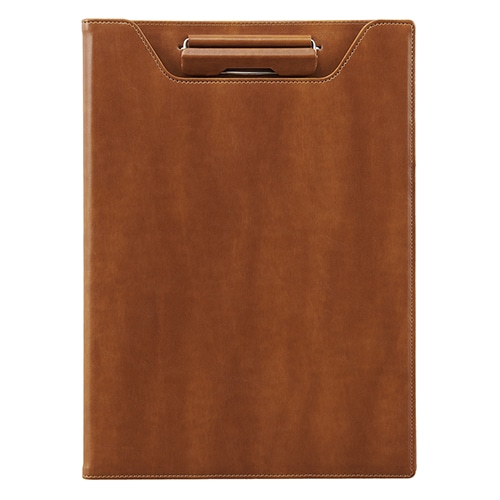 ●A4判E型のクリップファイル●表紙は360度折り返せるので、立ったままの筆記でも書き込みしやすい●名刺やメモが入れられる内ポケット付き●便利なペンホルダー付き●高級感のある合皮製●書類約50枚収容可能