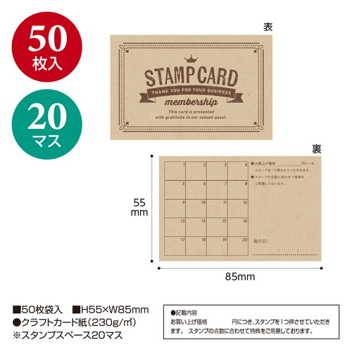 リピーター獲得に最適なスタンプカードです。飲食店やサロン、各種店舗で使いやすいデザインで、販促ツールとして幅広く活用できます。クラフトの厚手用紙で扱いやすく、集客力アップに貢献します。スタンプスペース20マス。