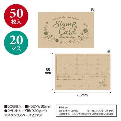 リピーター獲得に最適なスタンプカードです。飲食店やサロン、各種店舗で使いやすいデザインで、販促ツールとして幅広く活用できます。クラフトの厚手用紙で扱いやすく、集客力アップに貢献します。スタンプスペース20マス。