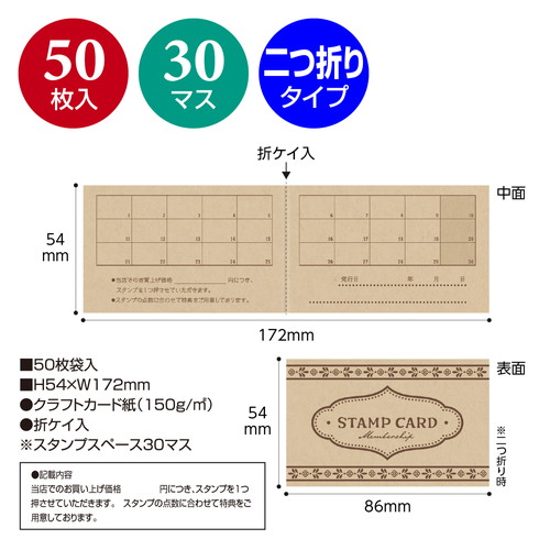 リピーター獲得に最適なスタンプカードです。飲食店やサロン、各種店舗で使いやすいデザインで、販促ツールとして幅広く活用できます。クラフトの厚手用紙で扱いやすく、集客力アップに貢献します。スタンプスペース30マス。