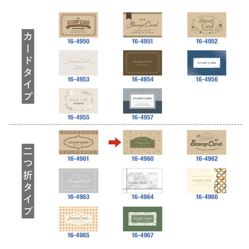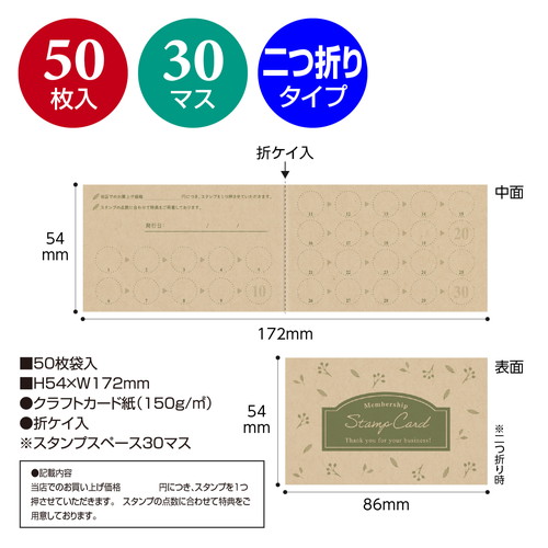 リピーター獲得に最適なスタンプカードです。飲食店やサロン、各種店舗で使いやすいデザインで、販促ツールとして幅広く活用できます。クラフトの厚手用紙で扱いやすく、集客力アップに貢献します。スタンプスペース30マス。