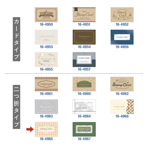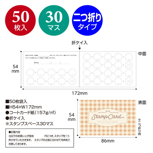 リピーター獲得に最適なスタンプカードです。飲食店やサロン、各種店舗で使いやすいデザインで、販促ツールとして幅広く活用できます。厚手の用紙二つ折りタイプで扱いやすく、集客力アップに貢献します。スタンプスペース30マス。