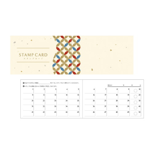 リピーター獲得に最適なスタンプカードです。飲食店やサロン、各種店舗で使いやすいデザインで、販促ツールとして幅広く活用できます。厚手の用紙二つ折りタイプで扱いやすく、集客力アップに貢献します。スタンプスペース50マス。