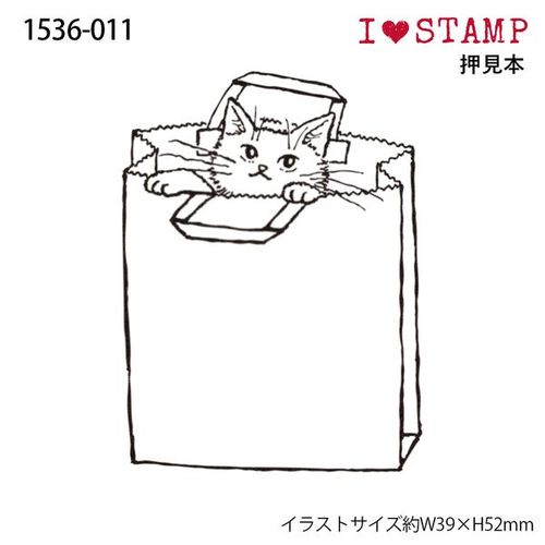 いろんなモチーフをいろんな絵柄でスタンプにした、木製ラバースタンプのシリーズです。紙袋に入ったネコ柄