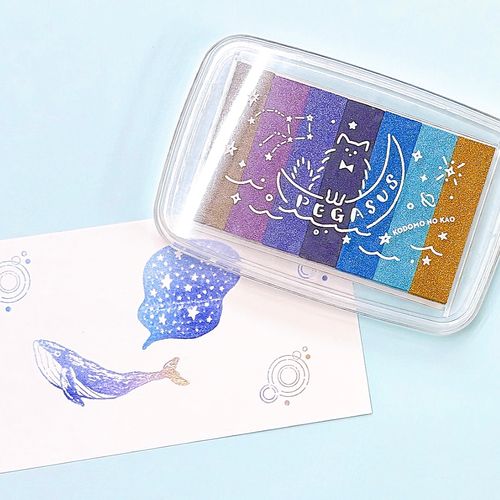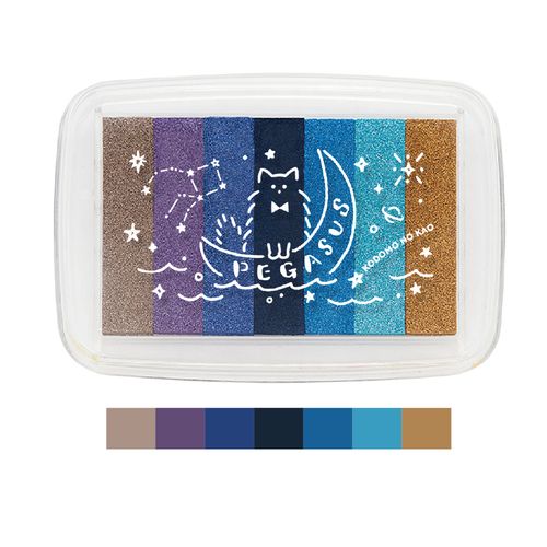 ひと押しで夜空の色味を再現!7色のラメ入りグラデーションが美しいインクパッドです。星屑のような輝きと深みのある色彩が、スタンプを特別なアートに変えてくれます。月と猫とペガサス座のパケも魅力。
