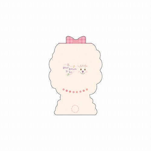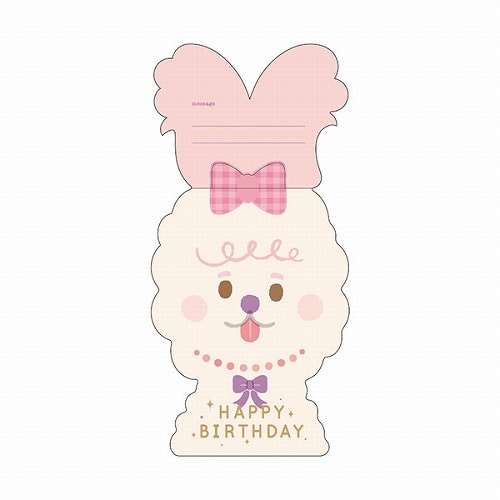 個性的でかわいい、わんこの顔の形にカットされた バースデーカードです。 前髪部分をめくると表情とメッセージが現れる 楽しい仕掛けになっています。 前髪の裏面がメッセージ欄になっており、 贈る人も受け取る人も笑顔になります。