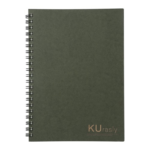 リングノートのリングは開閉の機能や品質に支障が出ない限界まで小さくすることで、かさばらず、より携帯しやすいコンパクトさを実現しました。 バッグにおさまりやすく、十分な筆記スペースを兼ね備えたベーシックなA5サイズ。 角には2mmの角丸加工を施し、角潰れ防止とスマートさを両立させました。本文用紙は、裏透けしにくく、目に優しい国産クリーム上質紙です。 アイデア整理から日記、仕事のメモまで使いやすい5mm方眼を採用しました。方眼罫は、細めのラインと素材になじむ配色によって書き手の自由度を追求したデザインです。【検索ハッシュタグ】#包む#Kurasly#ノート#環境配慮#高級感#国産#透けにくい#5mm方眼#角丸#A5#リングノート#コンパクト#スマート#持ち運びやすい#モスグリーン