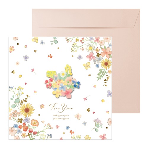 ウッドパーツが立体感を演出し、可愛らしい花々をあしらった二つ折色紙です。