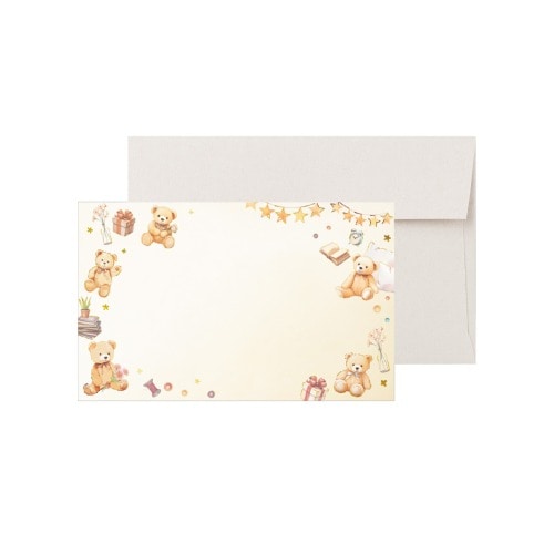 絵本の挿絵のような可愛らしいテディベアイラストのカードと、温かみのあるオフホワイトの封筒がセットになったアイテムです。