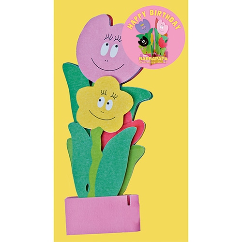 バーバパパのかわいいお花の誕生日カード。カードを左右に広げて360°回転させて、ゴムで巻き付けます。バーバパパのフラワーのお花が立体的になるポップアップカードです。タグの裏面にメッセージを記入できます。タグの文字:HAPPY BIRTHDAY 定型外郵便(規格内)