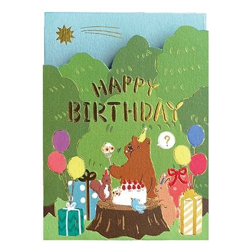 カードを広げると、未確認生物のUFOが森の動物たちをアブダクションしている様子が描かれたミニポップアップのバースデーカード。未知との遭遇です。ちょっとユニークなカード。裏面のメッセージ欄では森の動物たちと宇宙人が遭遇した様です。中面文字:「Have a wonderful Birthday」 ミニカード(郵送不可)・封筒色(ブラウン)