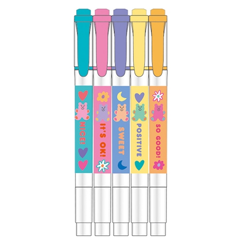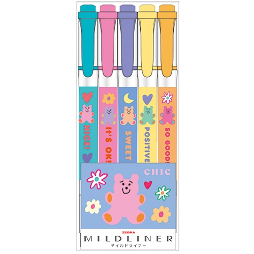 ゼブラの人気商品「マイルドライナー」とシックシリーズコラボ商品が新登場!5色セットなので、お気に入りのカラーがみつかるかも。カラー:マイルドスモークブルー・マイルドフューシャ・マイルドラベンダー・マイルドレモンイエロー・マイルドアプリコット 水性顔料使用 線の太さ:太4mm/細1.0~1.4mm