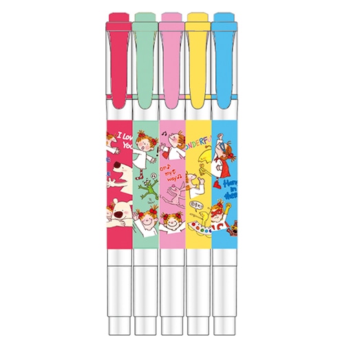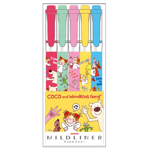 ゼブラの人気商品「マイルドライナー」とココちゃんのコラボ商品が再登場!5色セットなので、お気に入りのカラーがみつかるかも。カラー:マイルドレッド・マイルドブルーグリーン・マイルドフューシャ・マイルドゴールド・マイルドシアン 水性顔料使用 線の太さ:太4mm/細1.0~1.4mm