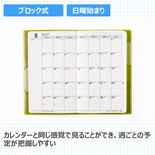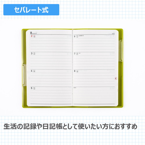 コンパクトがらも機能性バツグン!小さいサイズでも、付録内容が充実したシリーズ。6色のさまざまな記入形式から選べます。