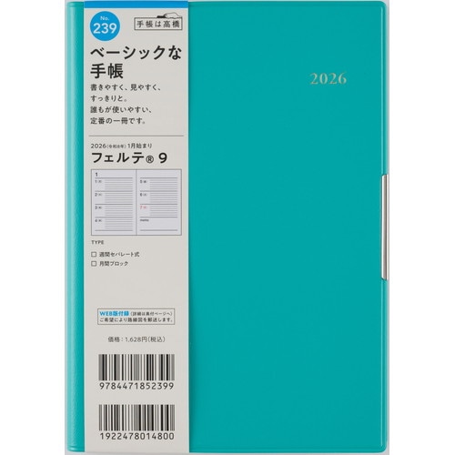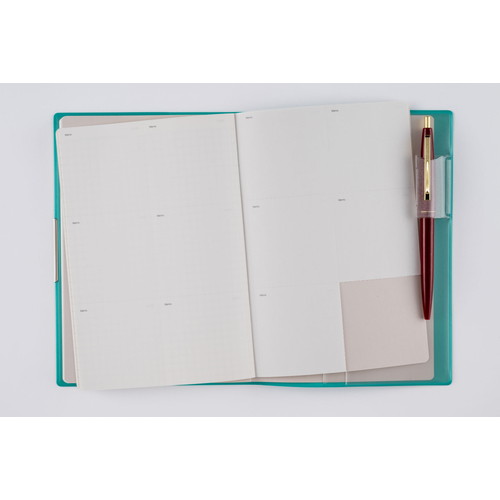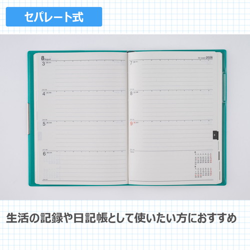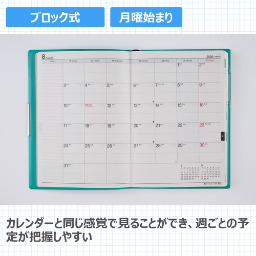 手帳ヘビーユーザーのあなたへ手帳を開くことの多い方にもうれしい、補強も兼ねたヘリ留め金具付きのカバーデザイン。記入欄の広さと携帯性を兼ね備えた一冊です。