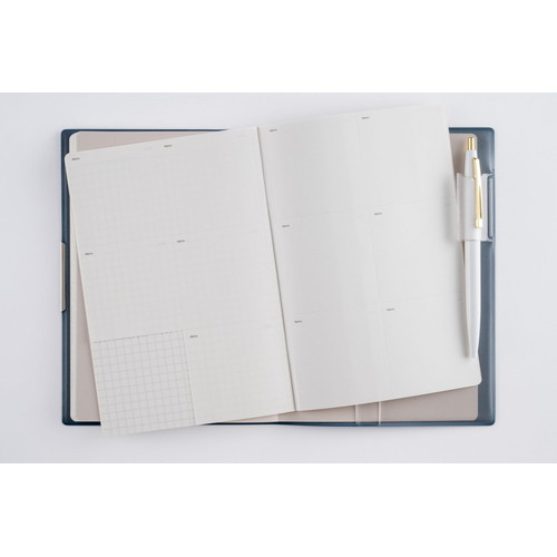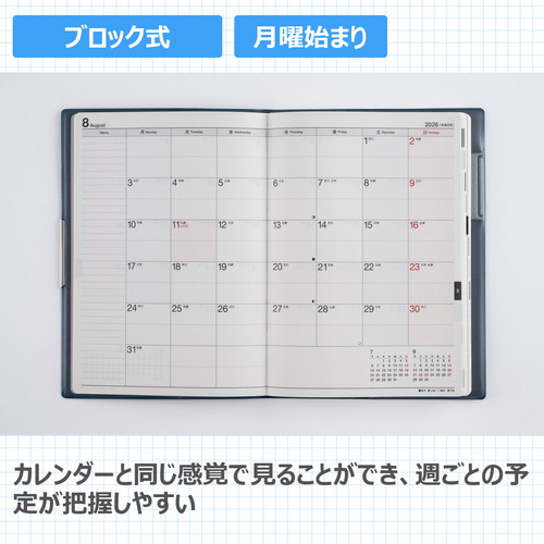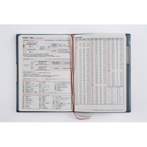 手帳ヘビーユーザーのあなたへ手帳を開くことの多い方にもうれしい、補強も兼ねたヘリ留め金具付きのカバーデザイン。記入欄の広さと携帯性を兼ね備えた一冊です。