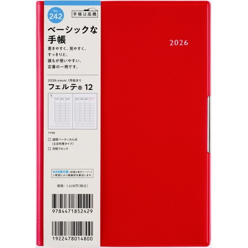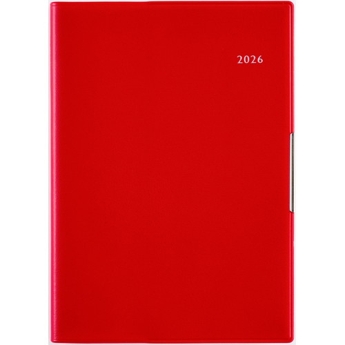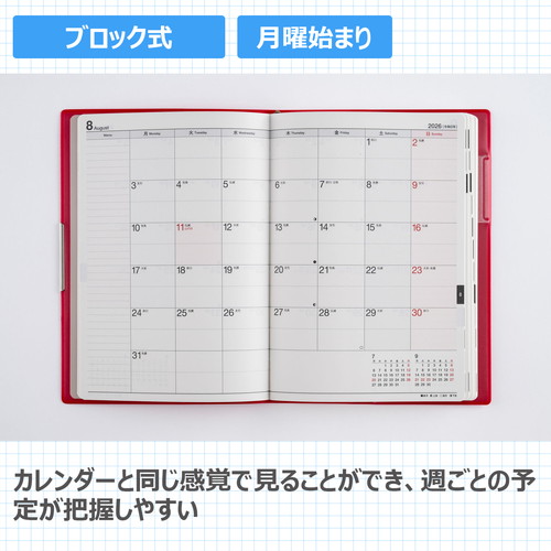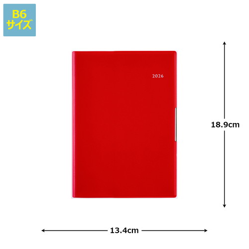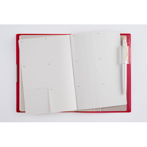 手帳ヘビーユーザーのあなたへ手帳を開くことの多い方にもうれしい、補強も兼ねたヘリ留め金具付きのカバーデザイン。記入欄の広さと携帯性を兼ね備えた一冊です。