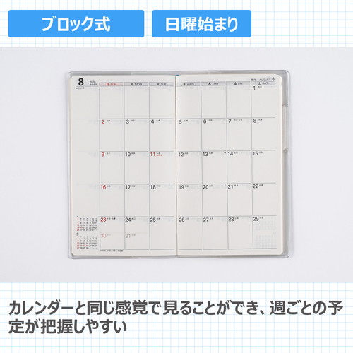 「見開き1ヵ月+メモ」のシンプルさが人気!カレンダーと同じで見やすい日曜始まり、土日均等タイプです。