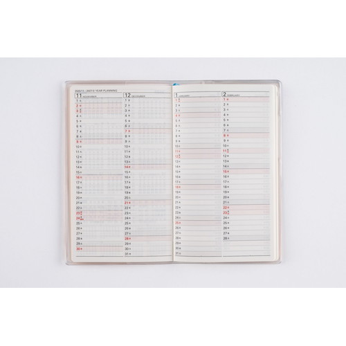 「見開き1ヵ月+メモ」のシンプルさが人気!カレンダーと同じで見やすい日曜始まり、土日均等タイプです。