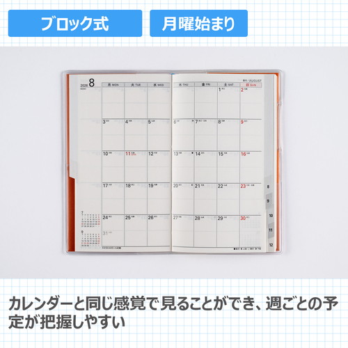 「見開き1ヵ月+メモ」のシンプルさが人気!「薄さ」と「軽さ」が人気の土日均等タイプ。一冊目にはもちろん、趣味やプライベートなどサブ手帳としてもオススメです。